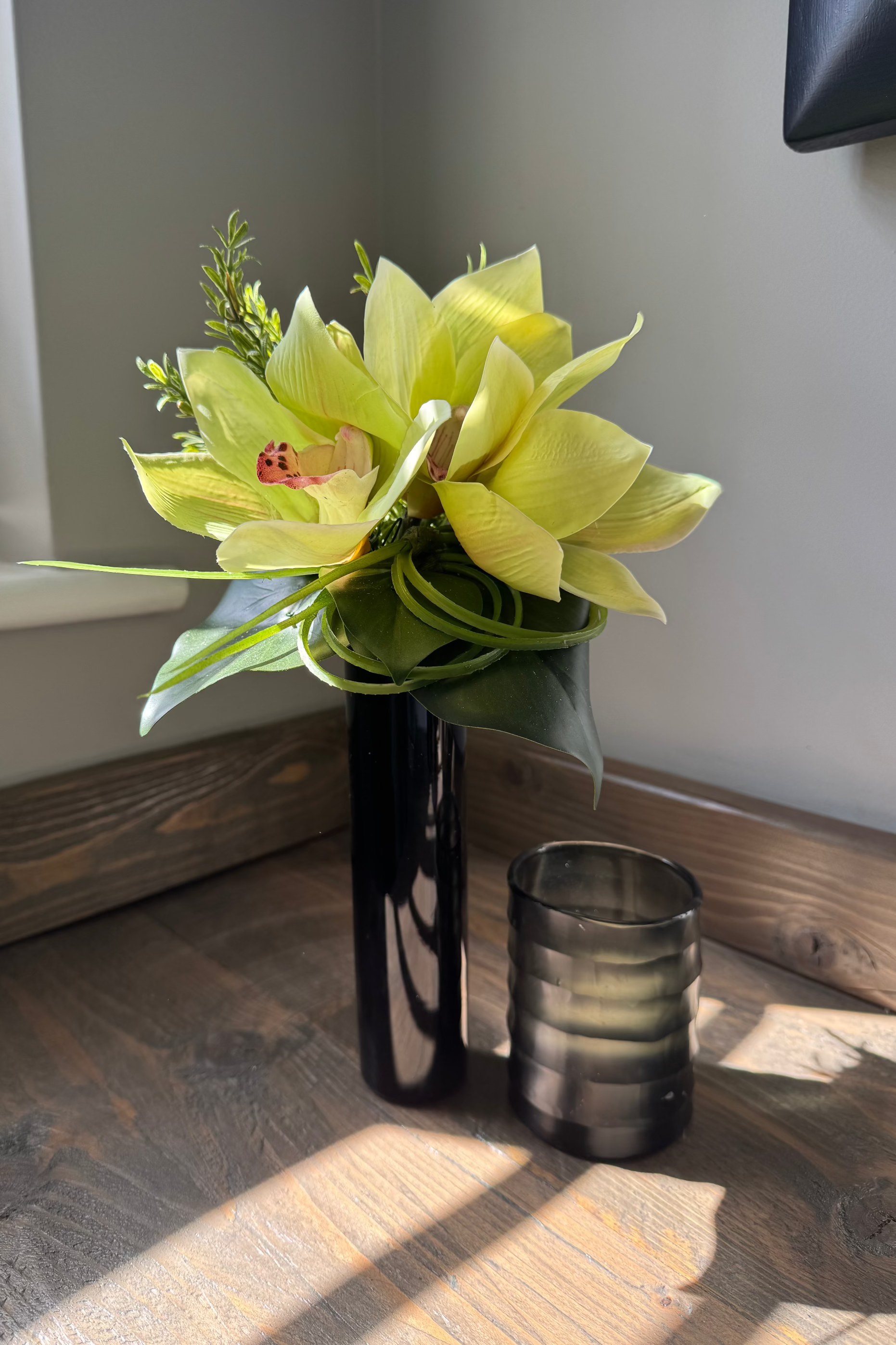 Cymbidium Orchid and Ivy Leaf in a Black Glass Cylinder (Green)