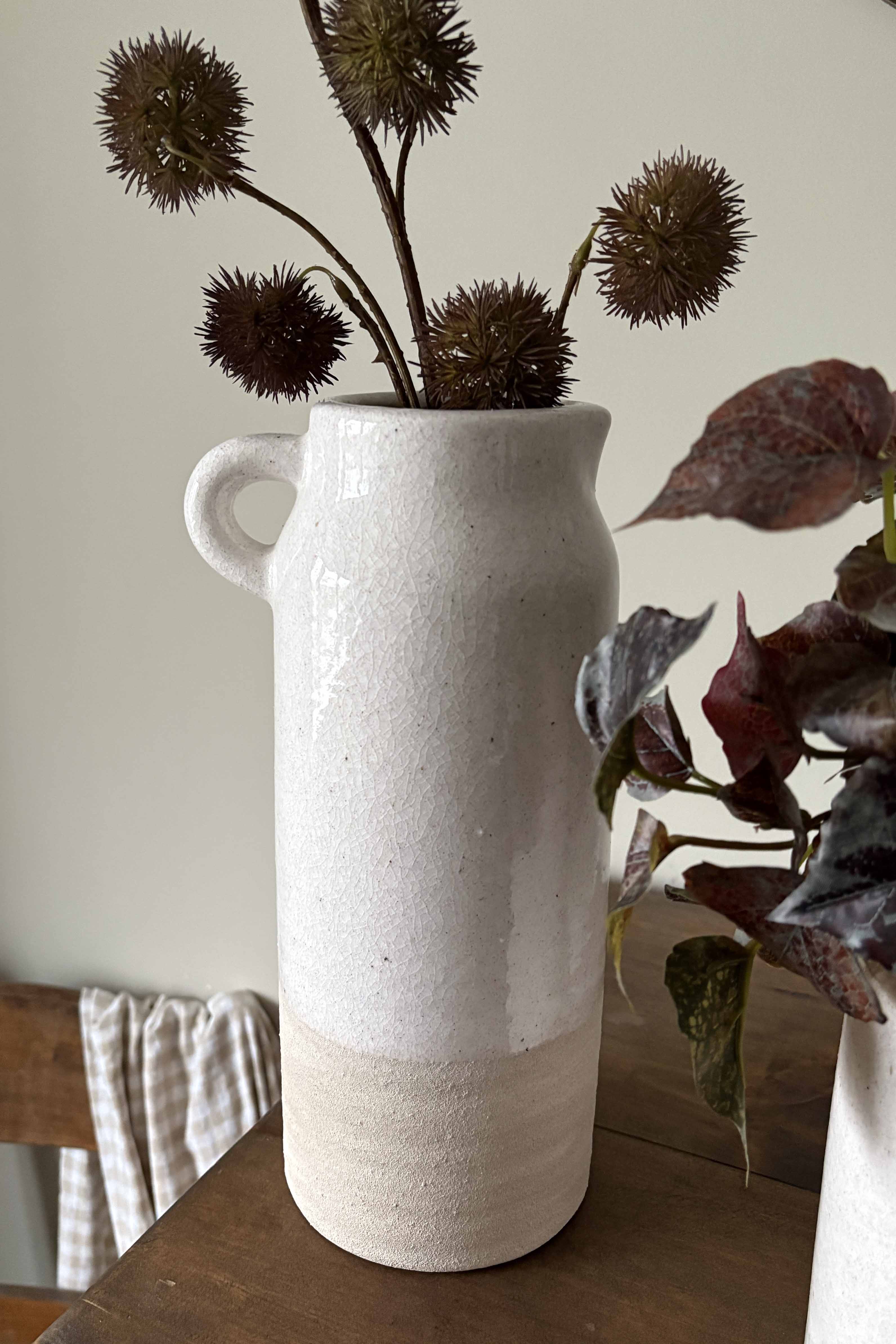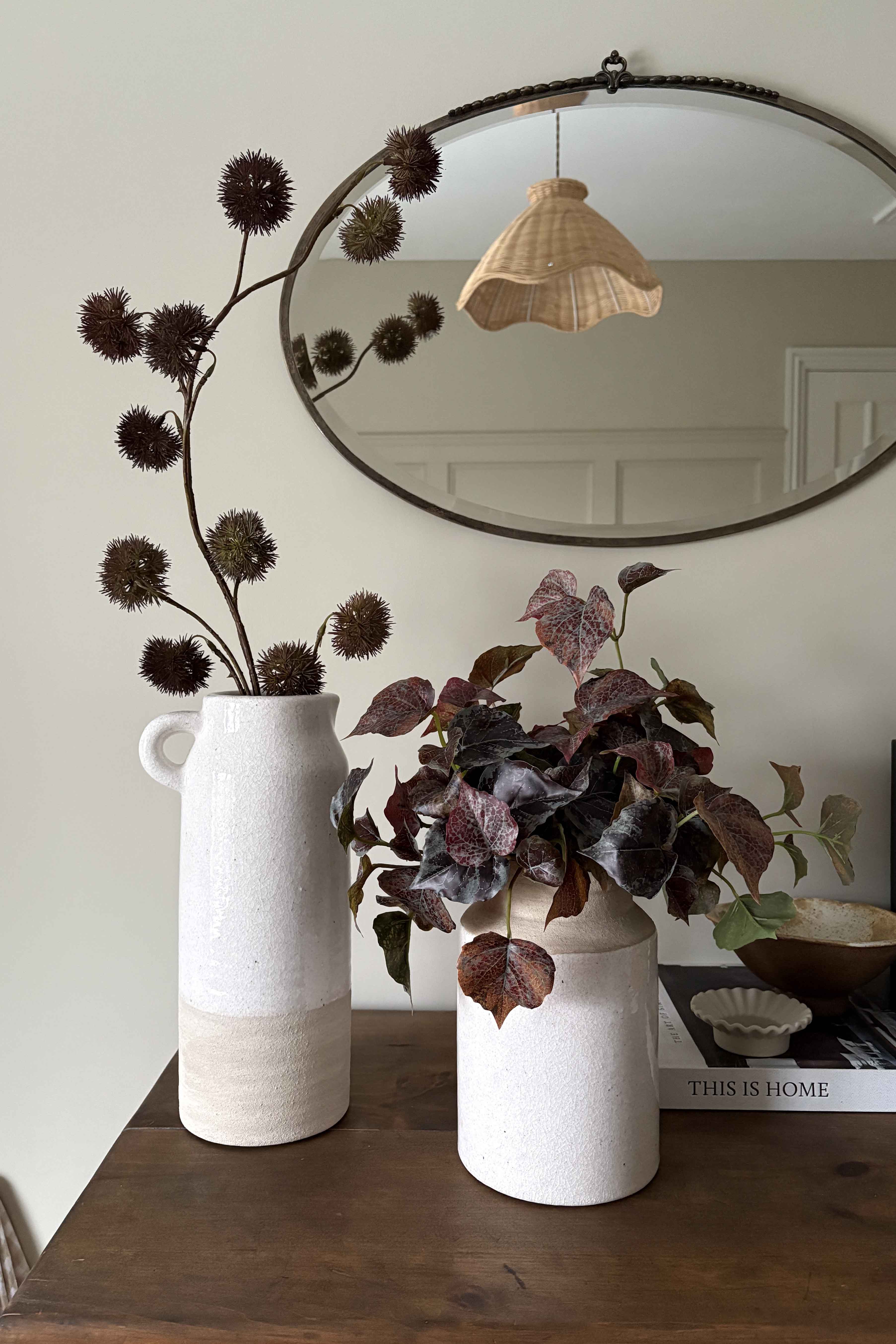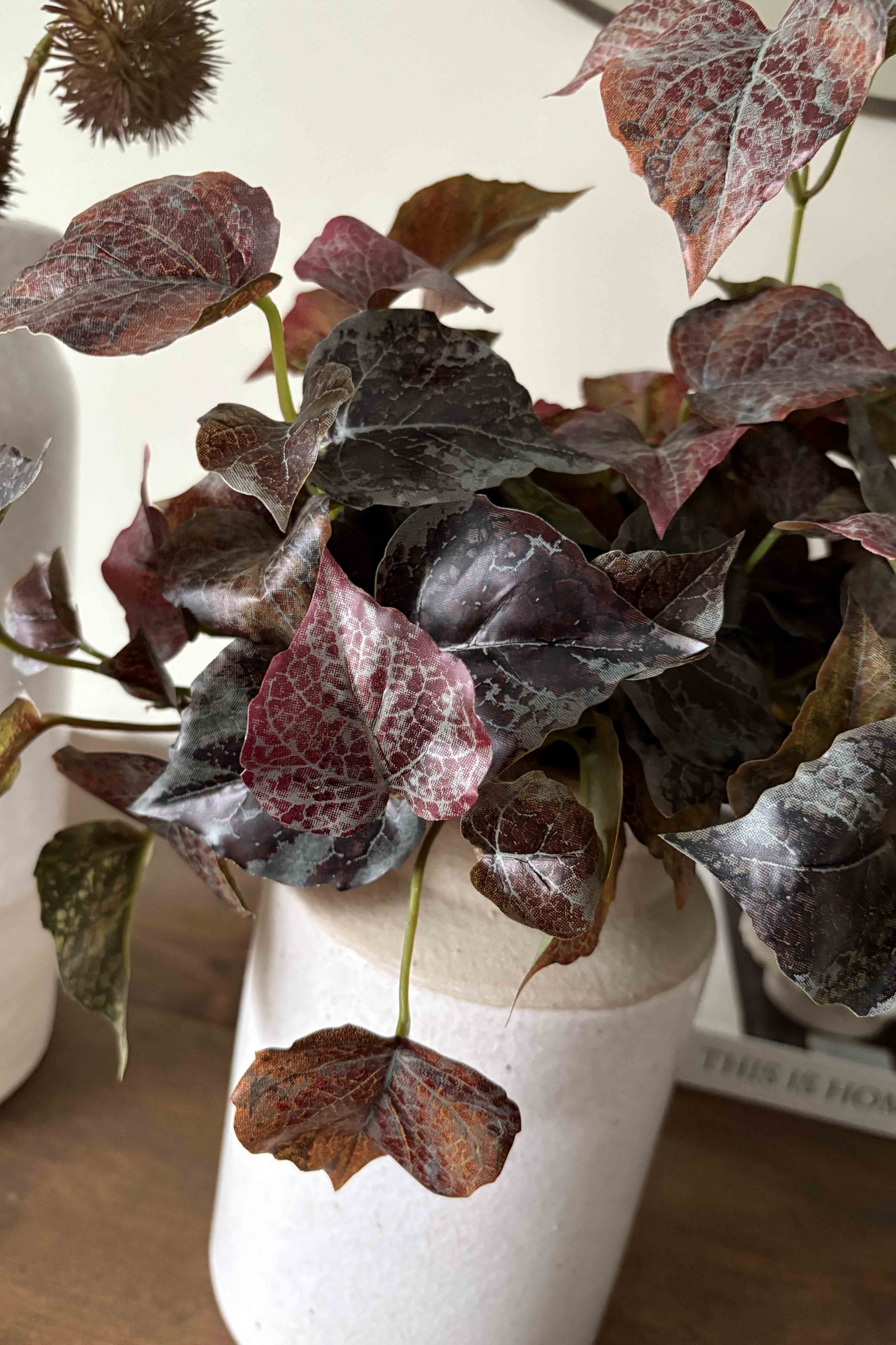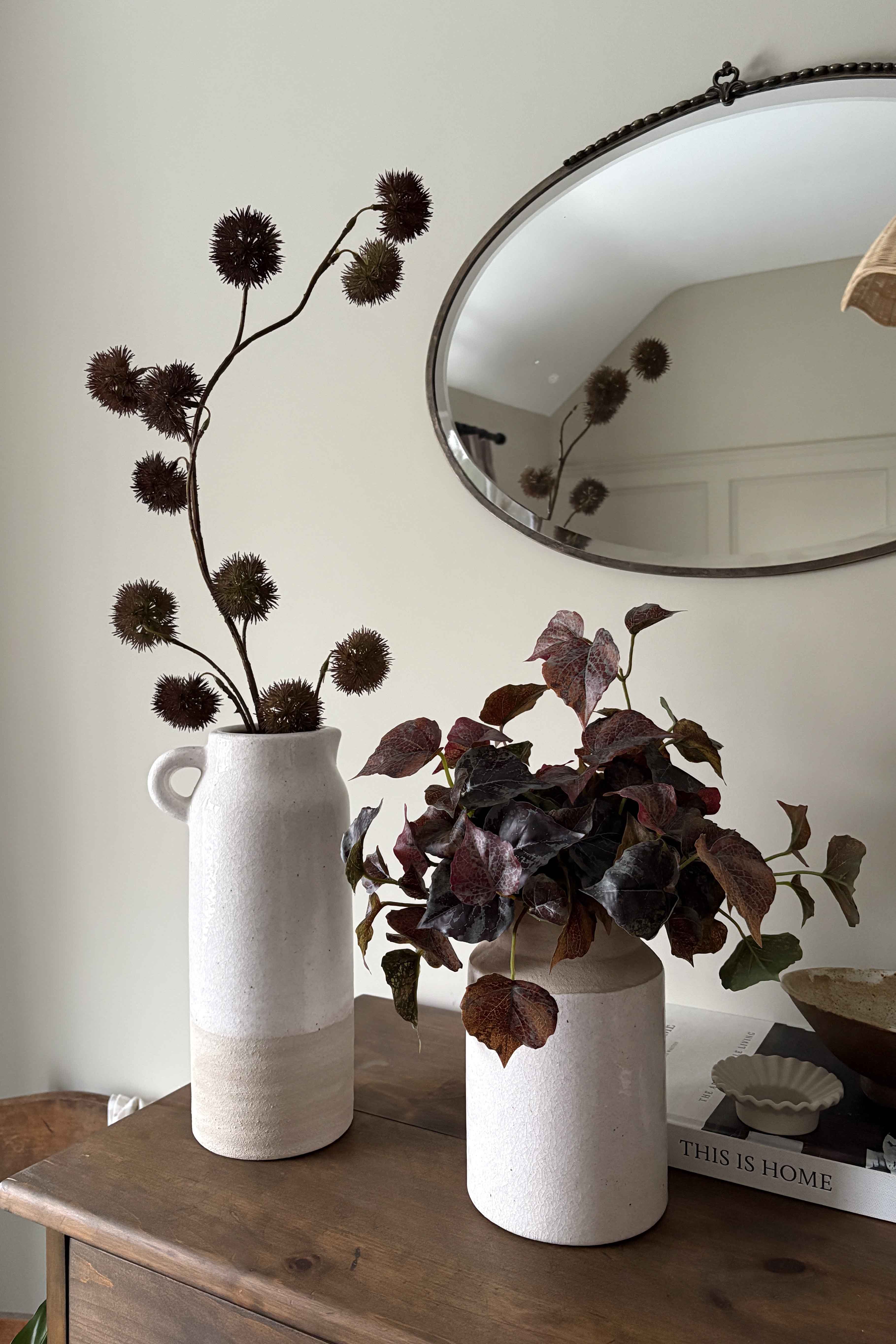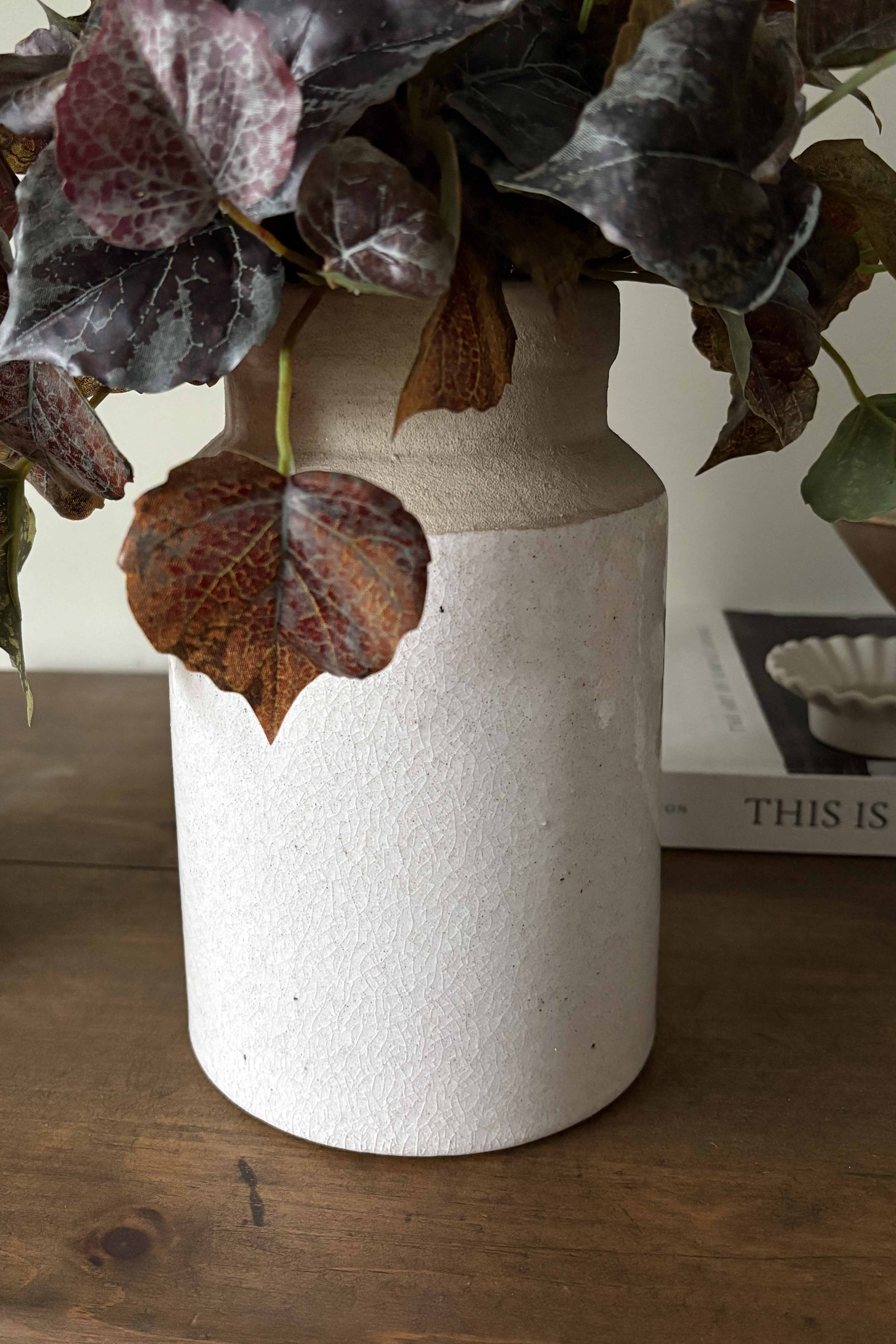 Set of two rustic cream vases with deep burgundy Ivy and Chestnut Spray. These refined contemporary arrangements are the perfect pairing for an entrance or side table; offering generous height and a pop of contrast between the soft cream and rich burgundy.