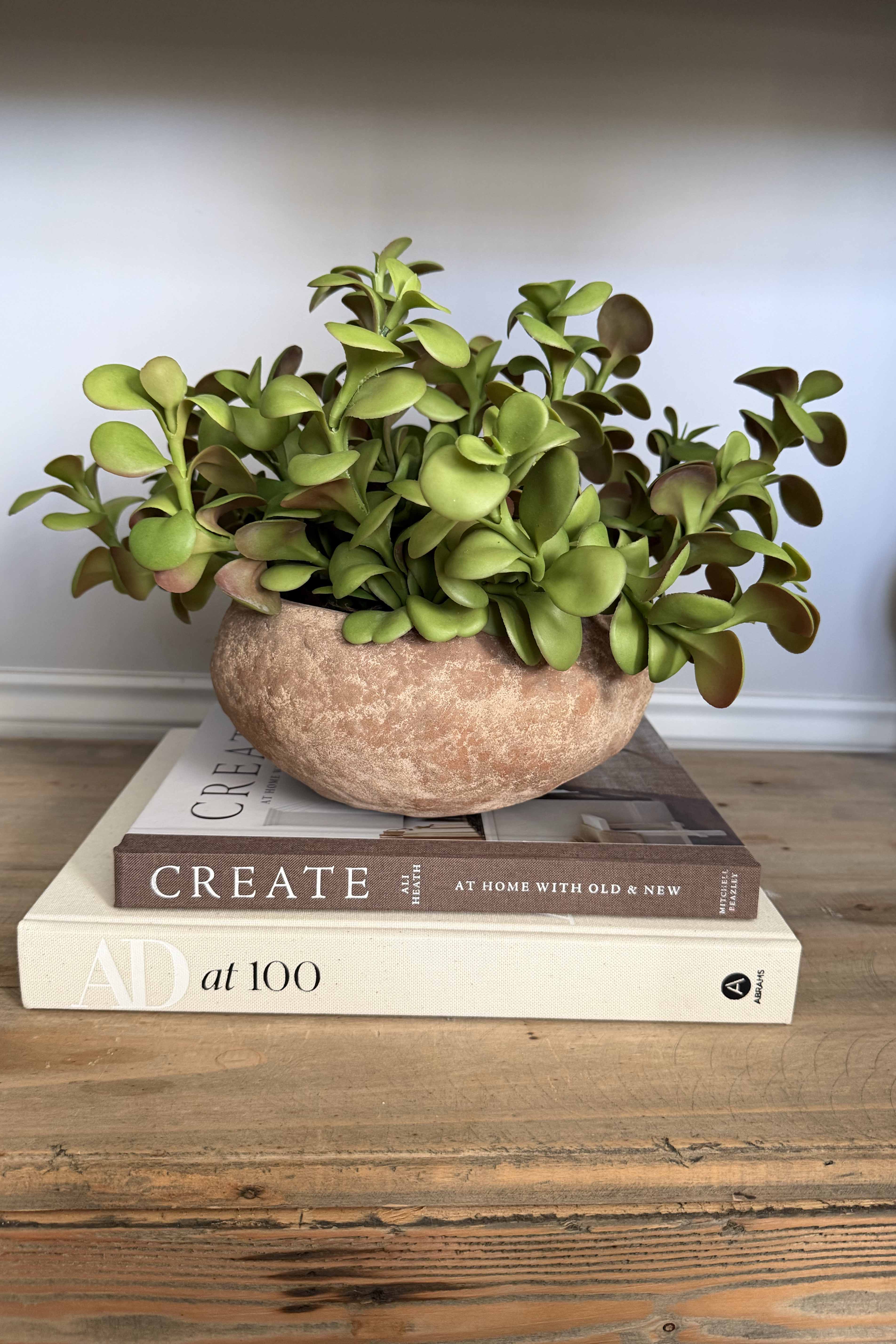 Very tactile and realistic Crassula spray planted naturally in a beautiful organic terracotta bowl.