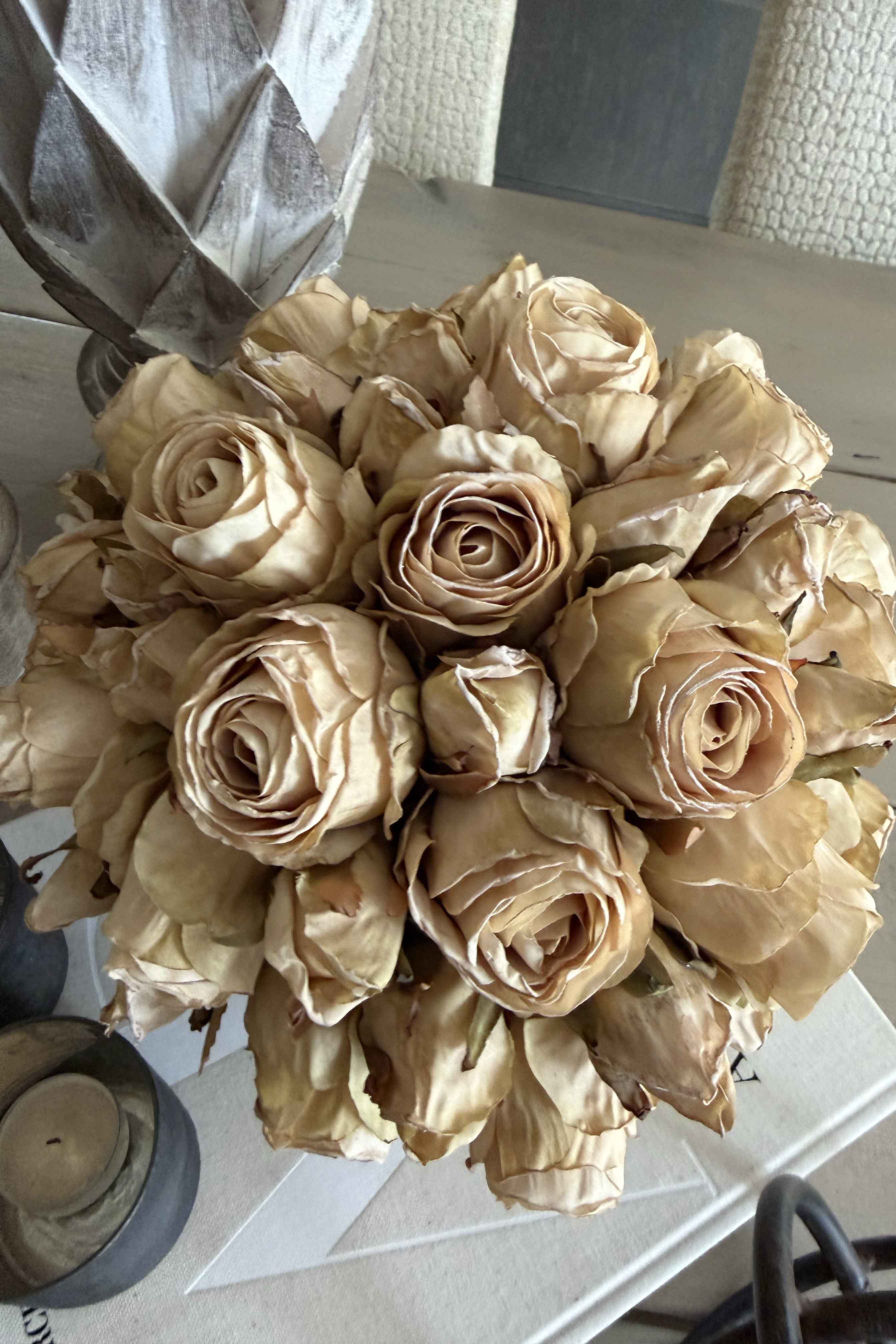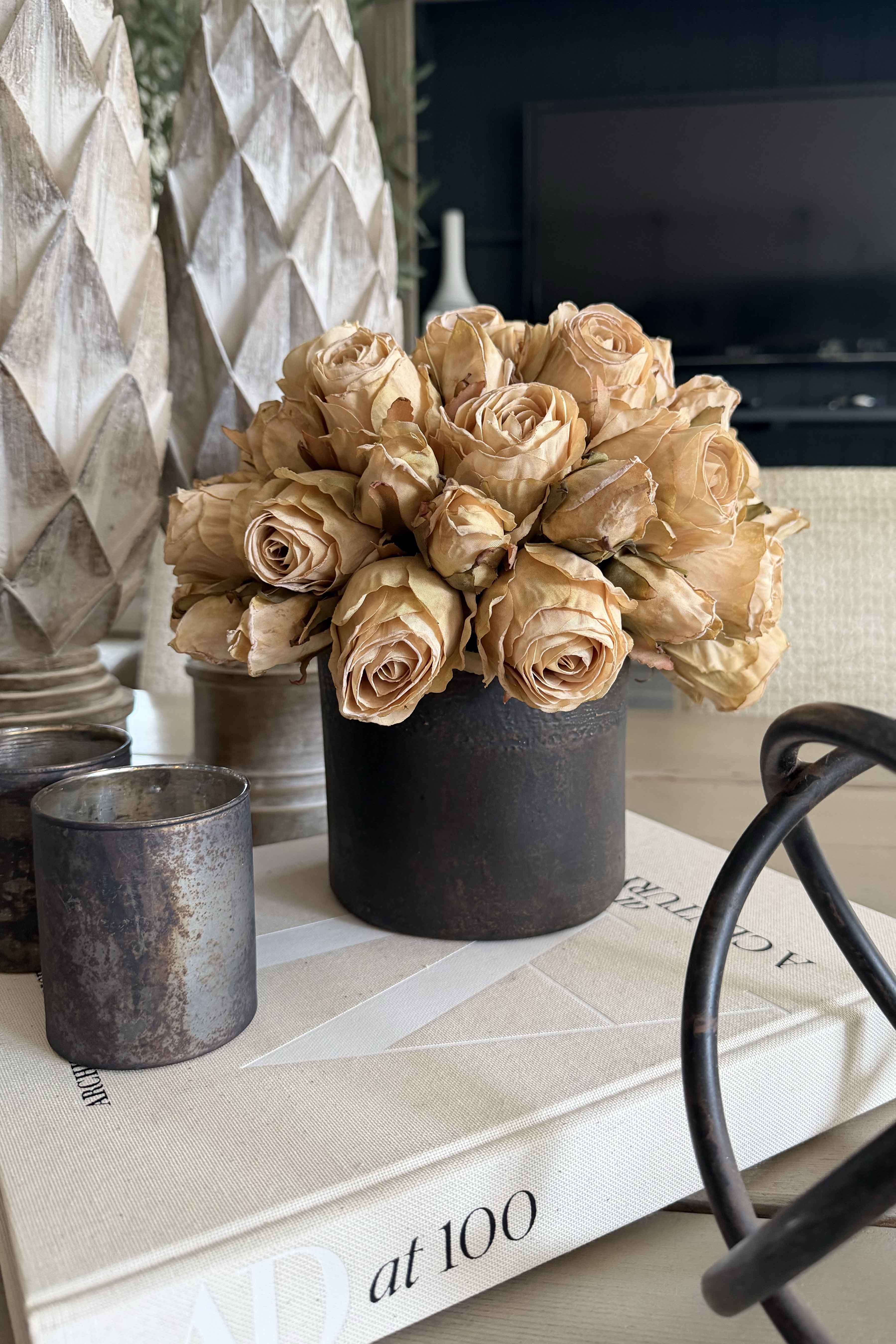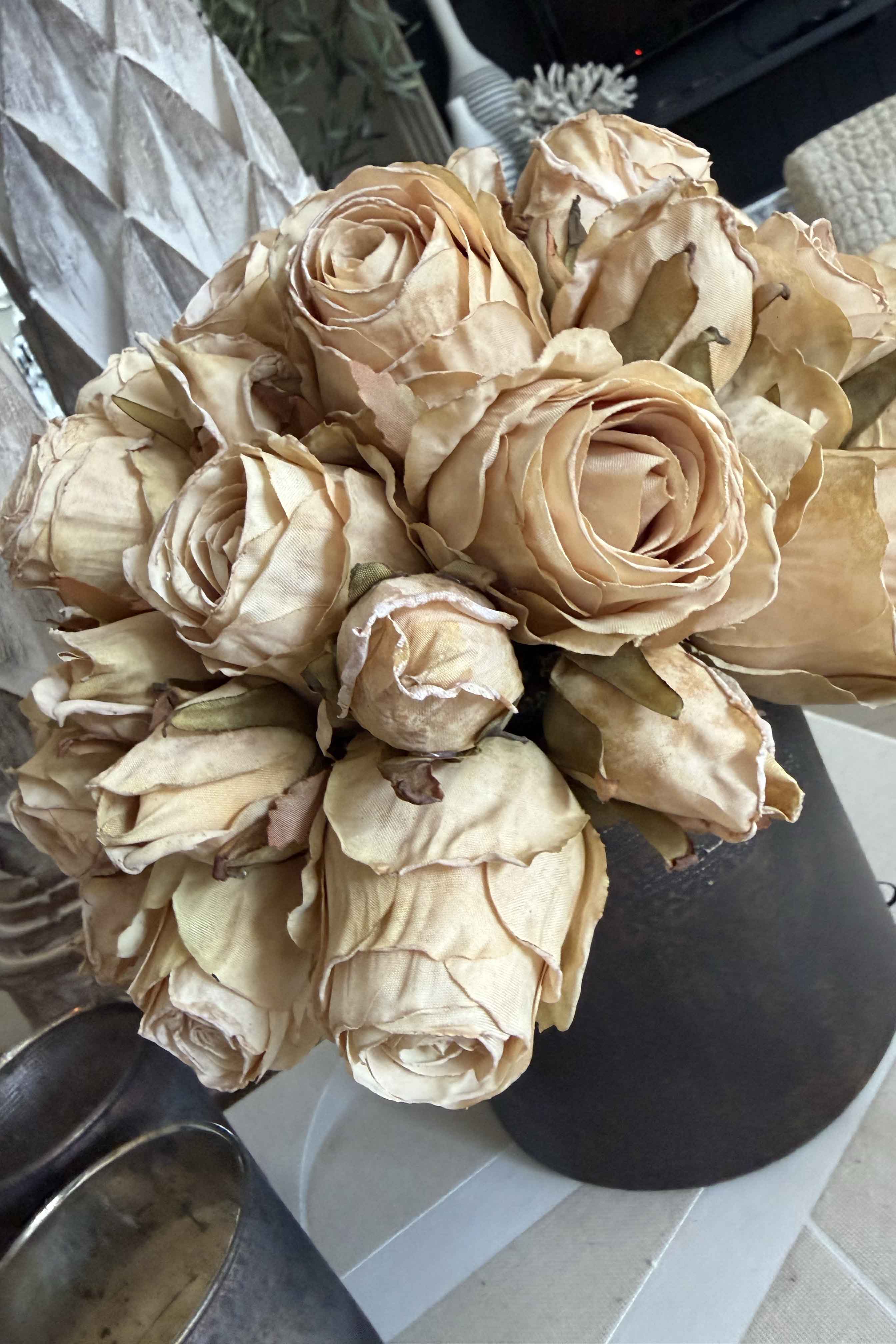 Vintage peach Roses arranged head to head in a beautiful hand painted bronze stone vase.