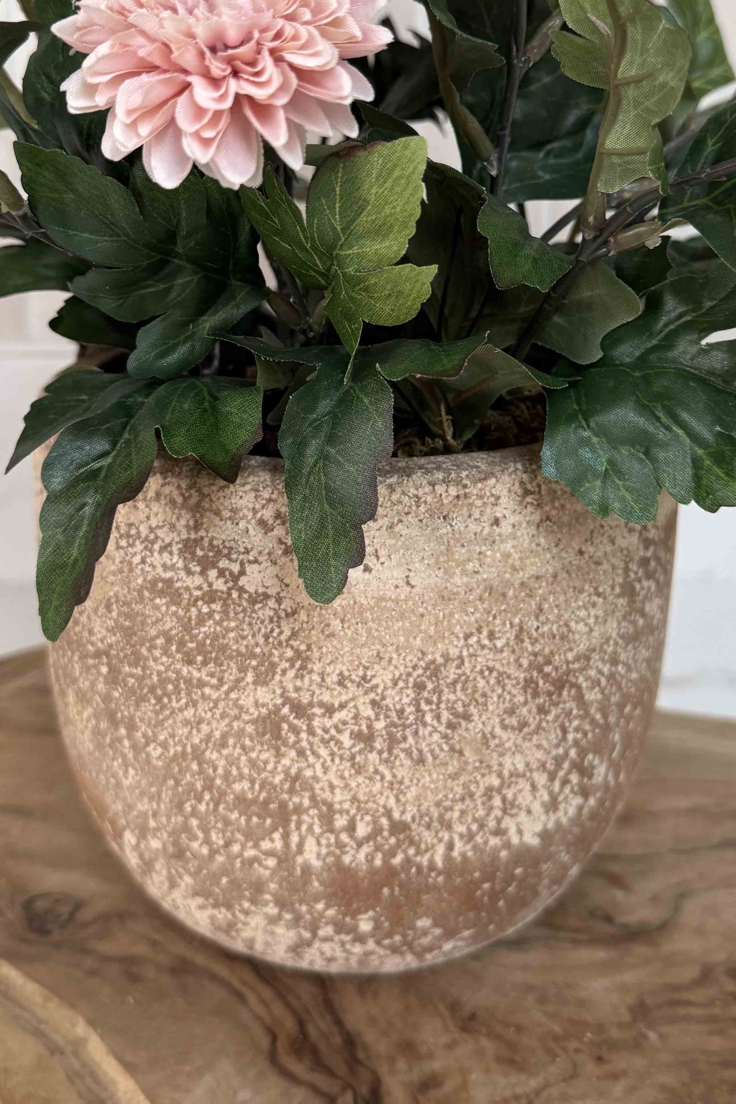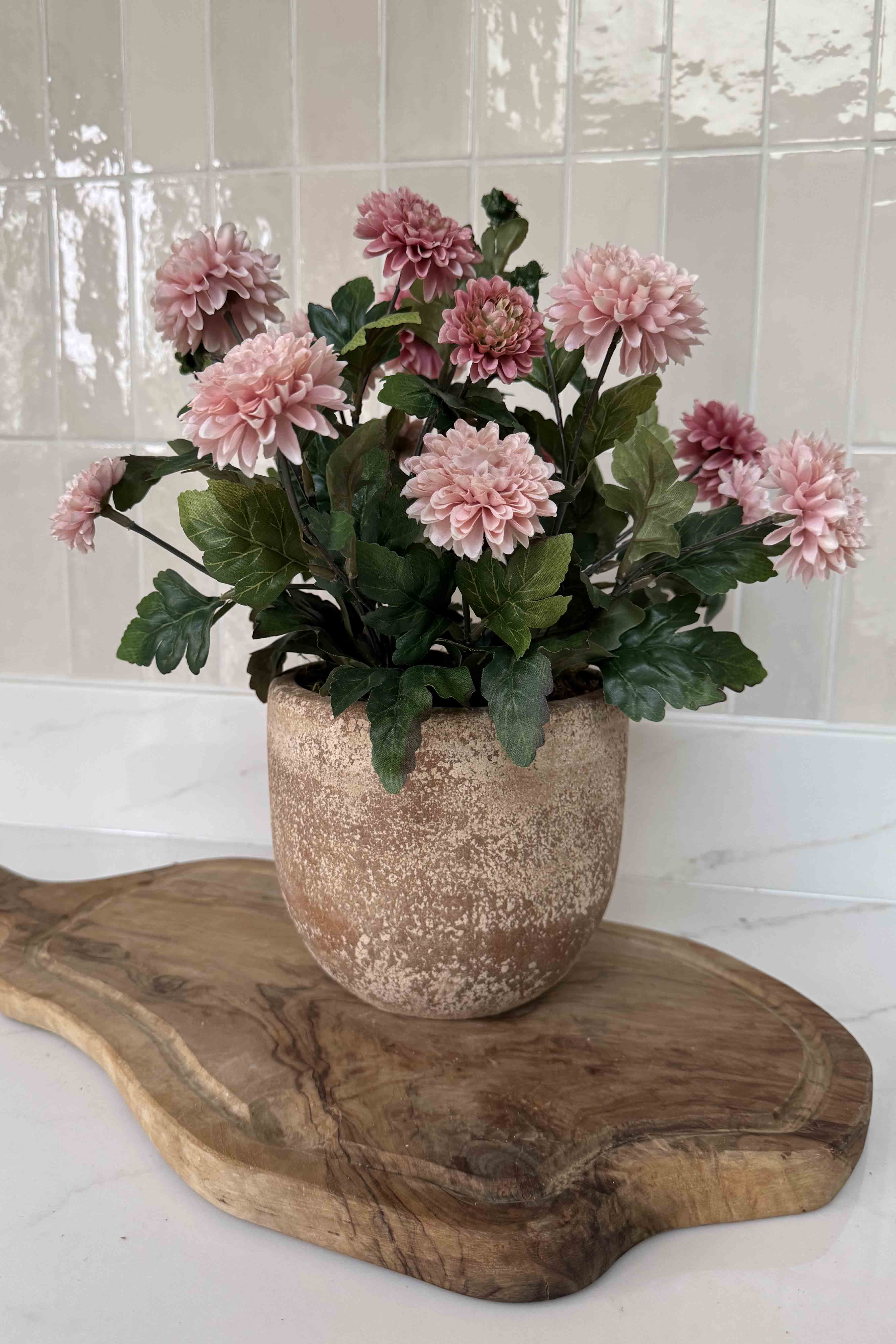 Pink Chrysanthemum naturally arranged in a rustic terracotta pot.