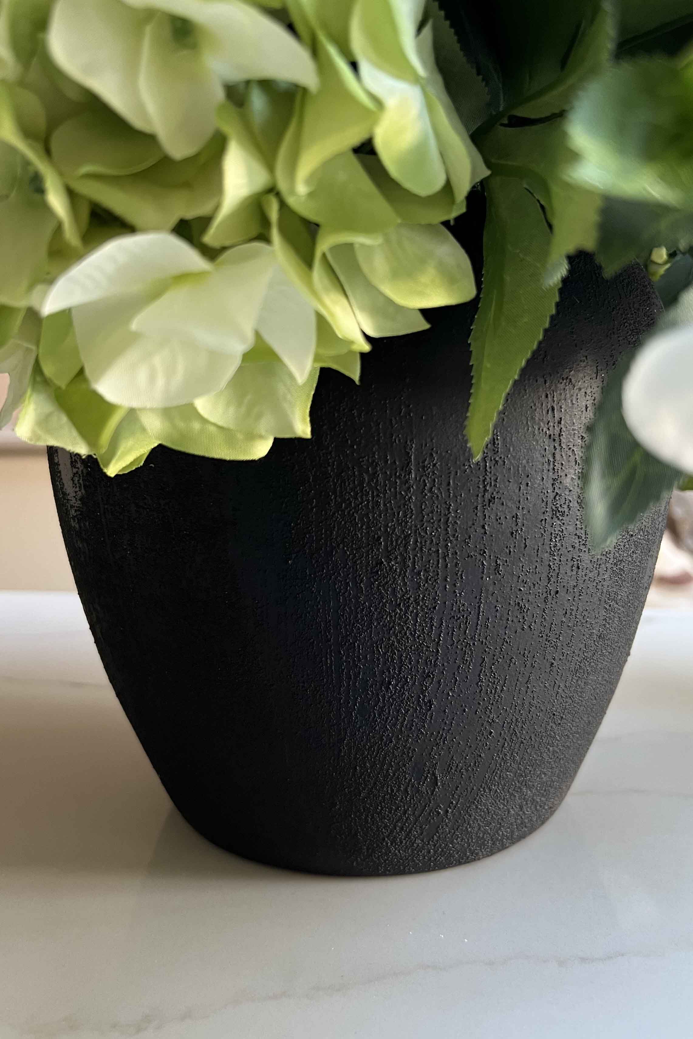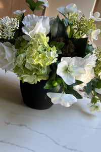 A very "fresh" combination of greens and whites. Faux white Hellebore, Rose and Queen Anne's Lace naturally arranged with a beautiful Ivy leaf in a textured black stone vase. A very versatile and elegant piece that would work in many places around the home.