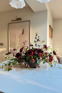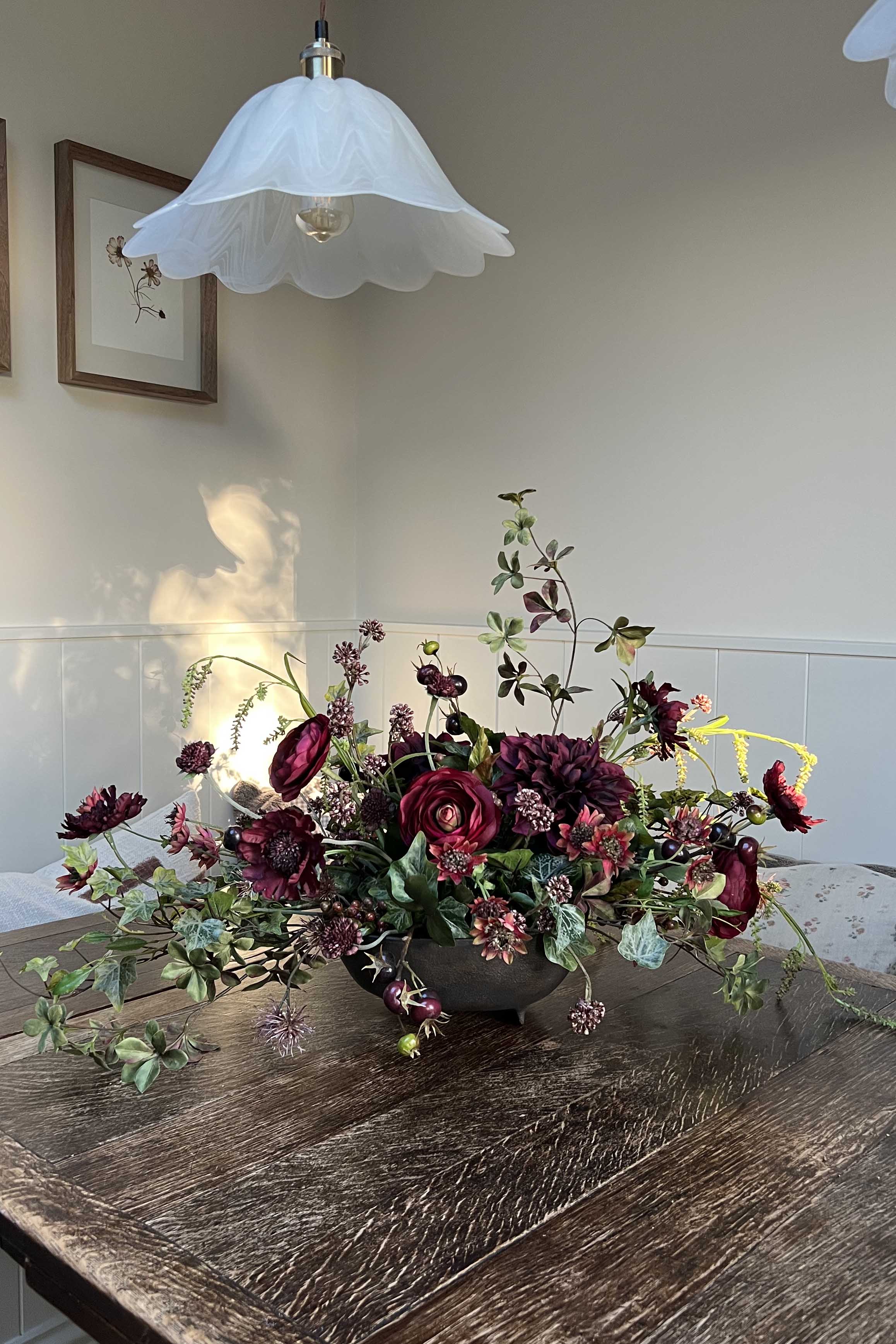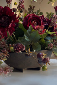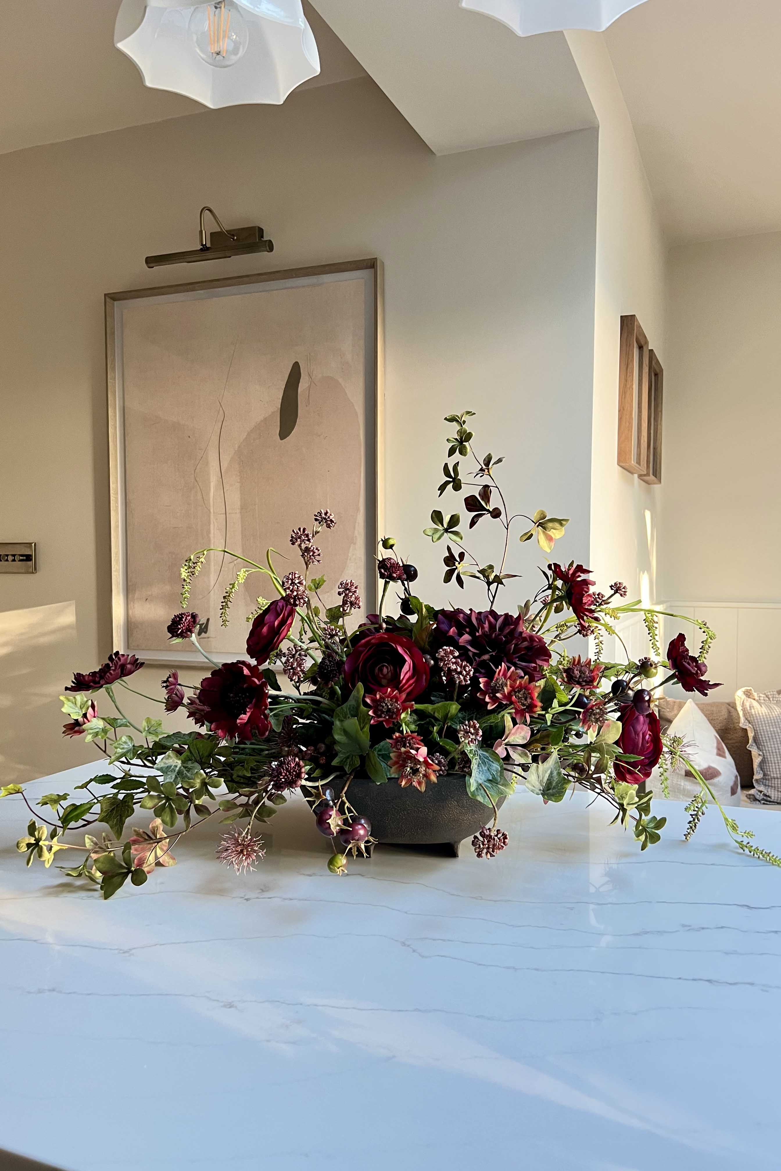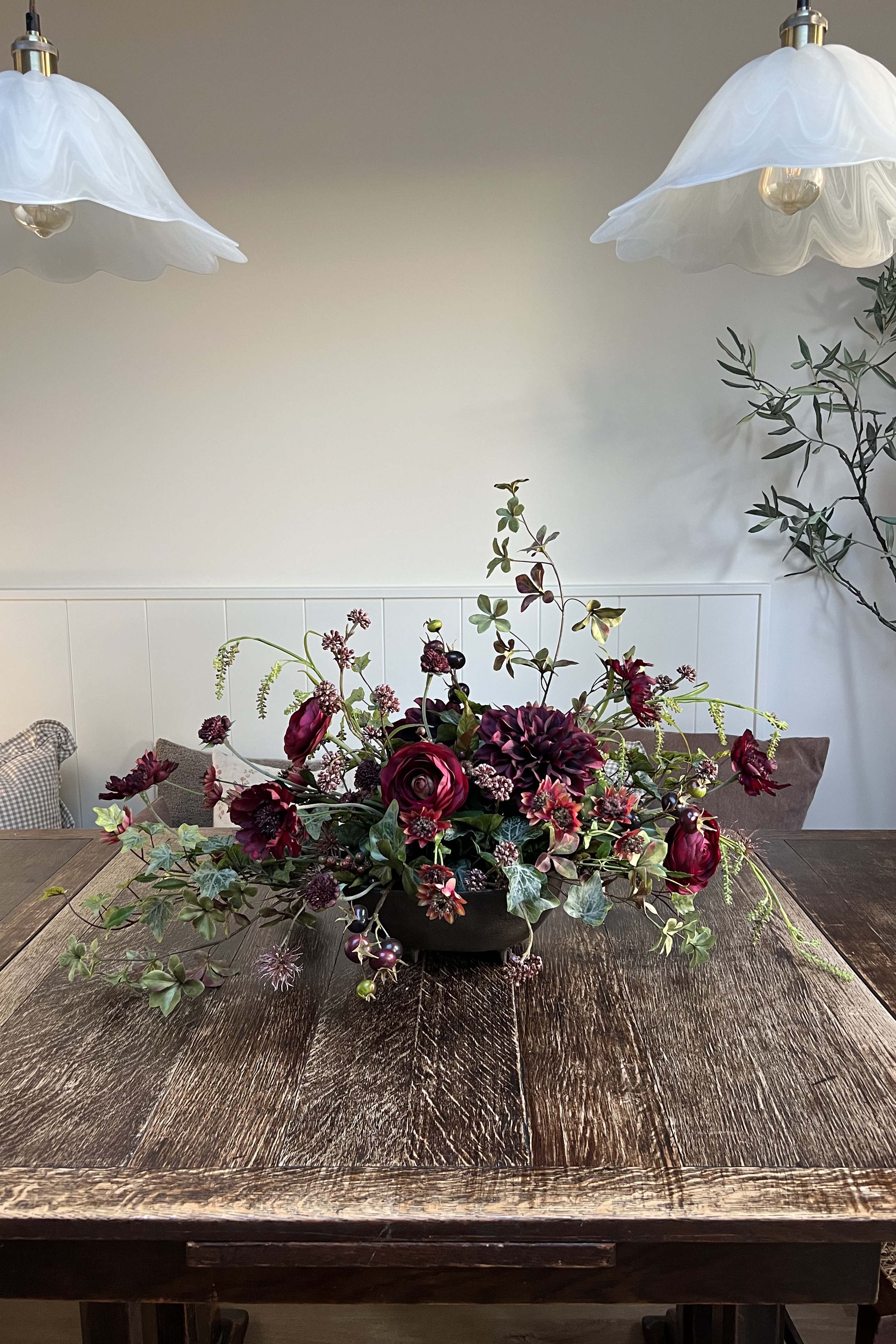 A beautifully 'wild' looking faux arrangement featuring deep, earthy reds and burgundies... a stunning piece for a dining table, console or kitchen island.
