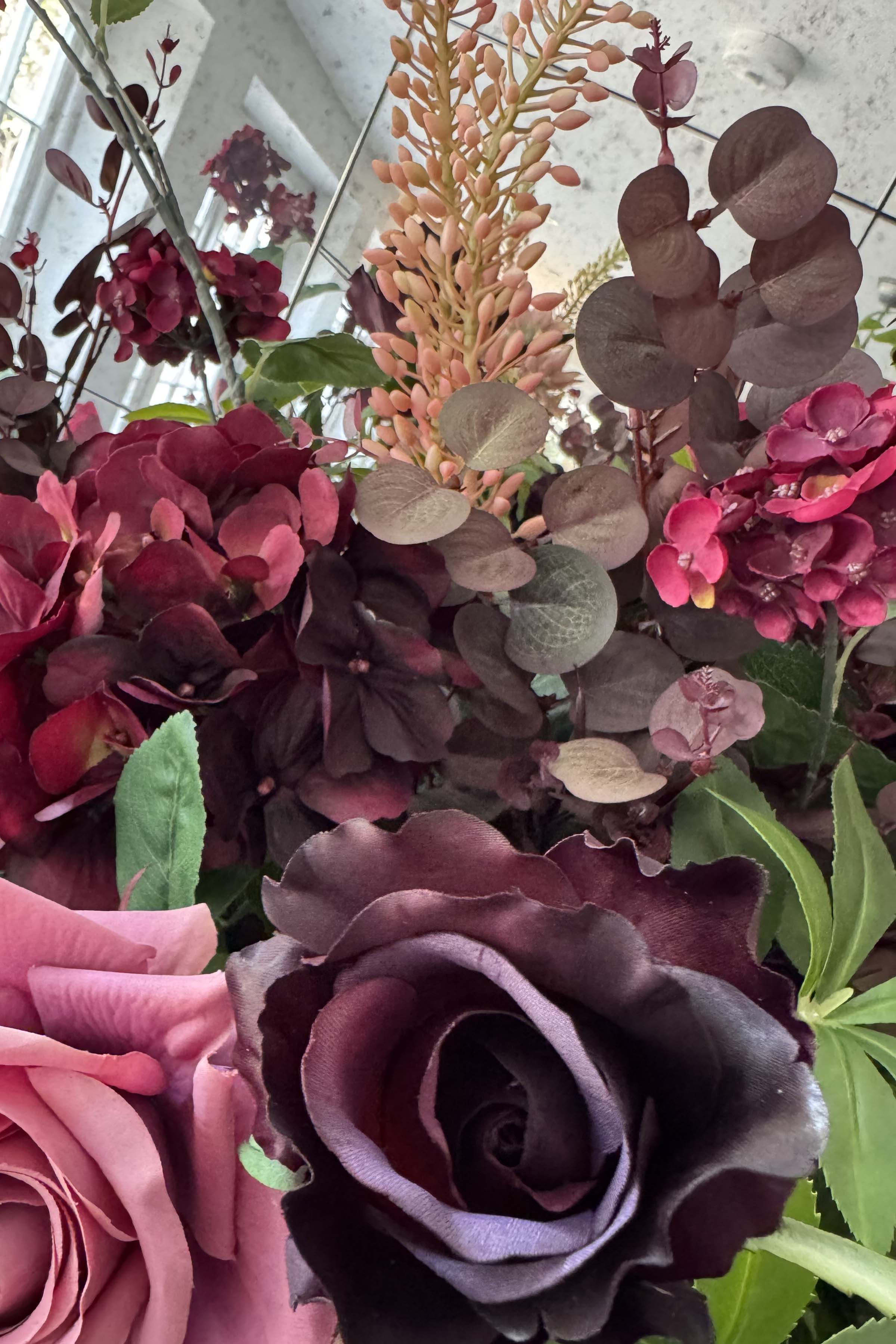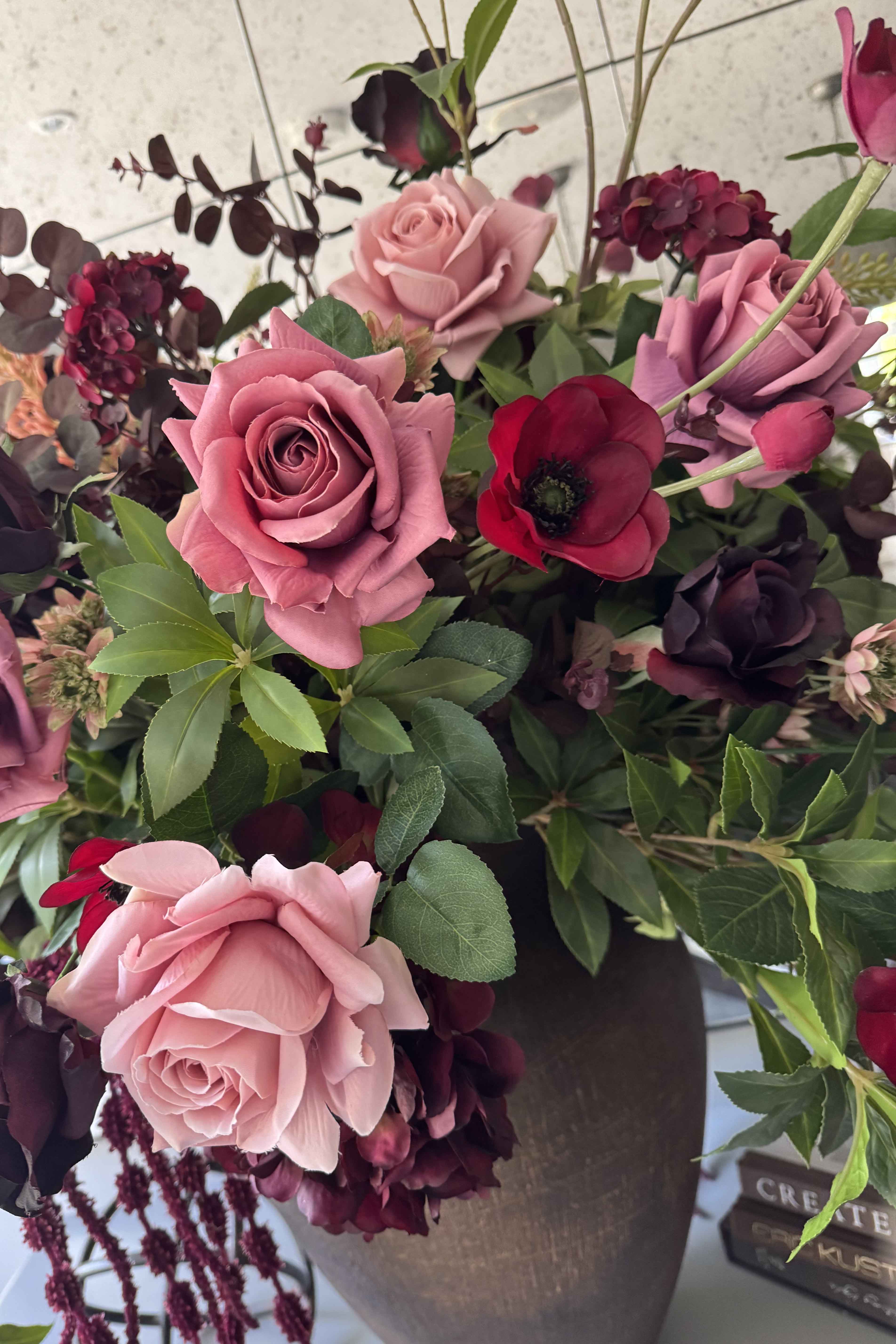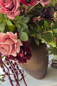 Rose, Anemone and Trailing Amaranthus arranged in a beautiful hand-painted textured bronze vase. Featuring a stunning combination of soft muted pinks and contrasting deep burgundy tones; such a gorgeous and breathtaking autumnal centrepiece.