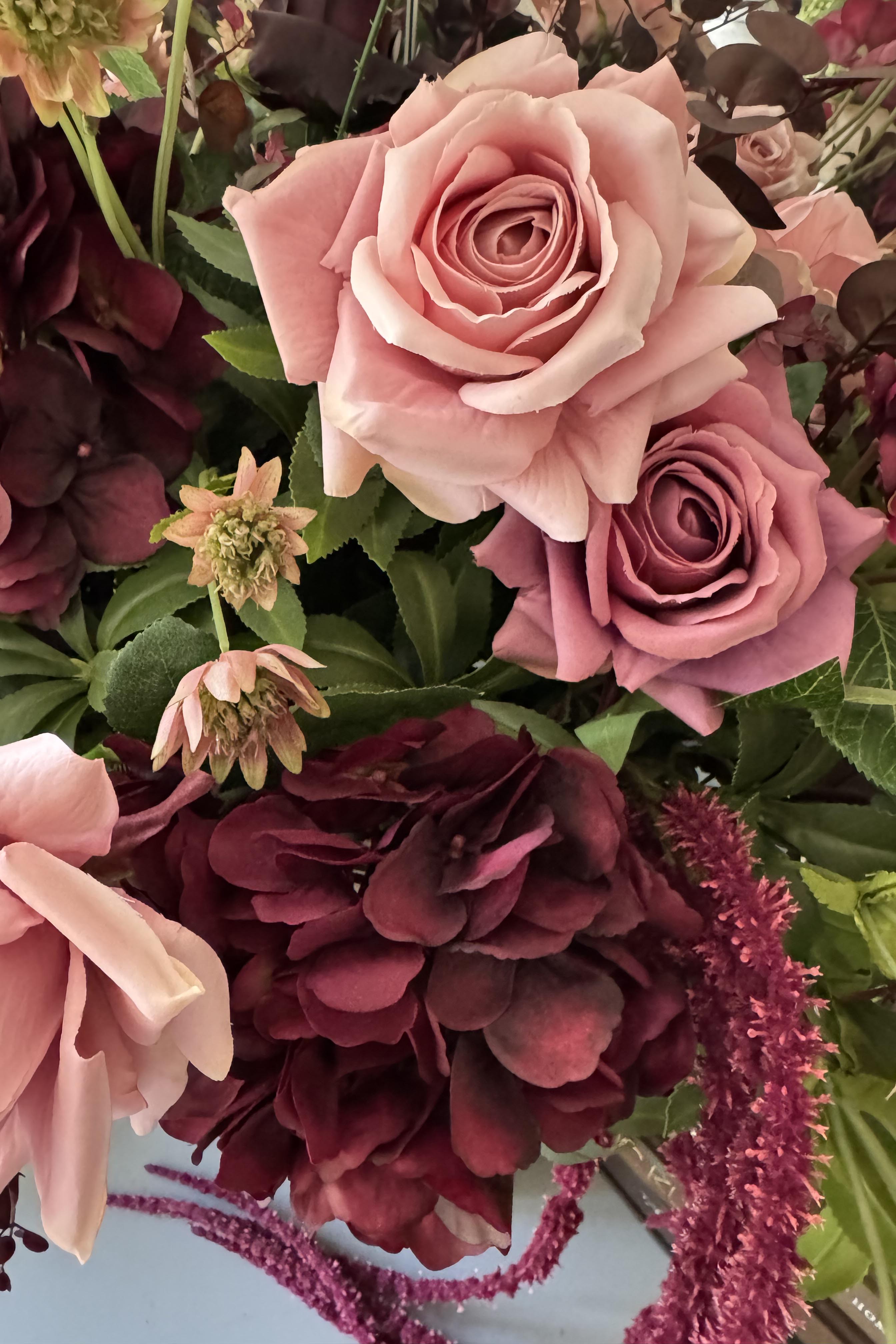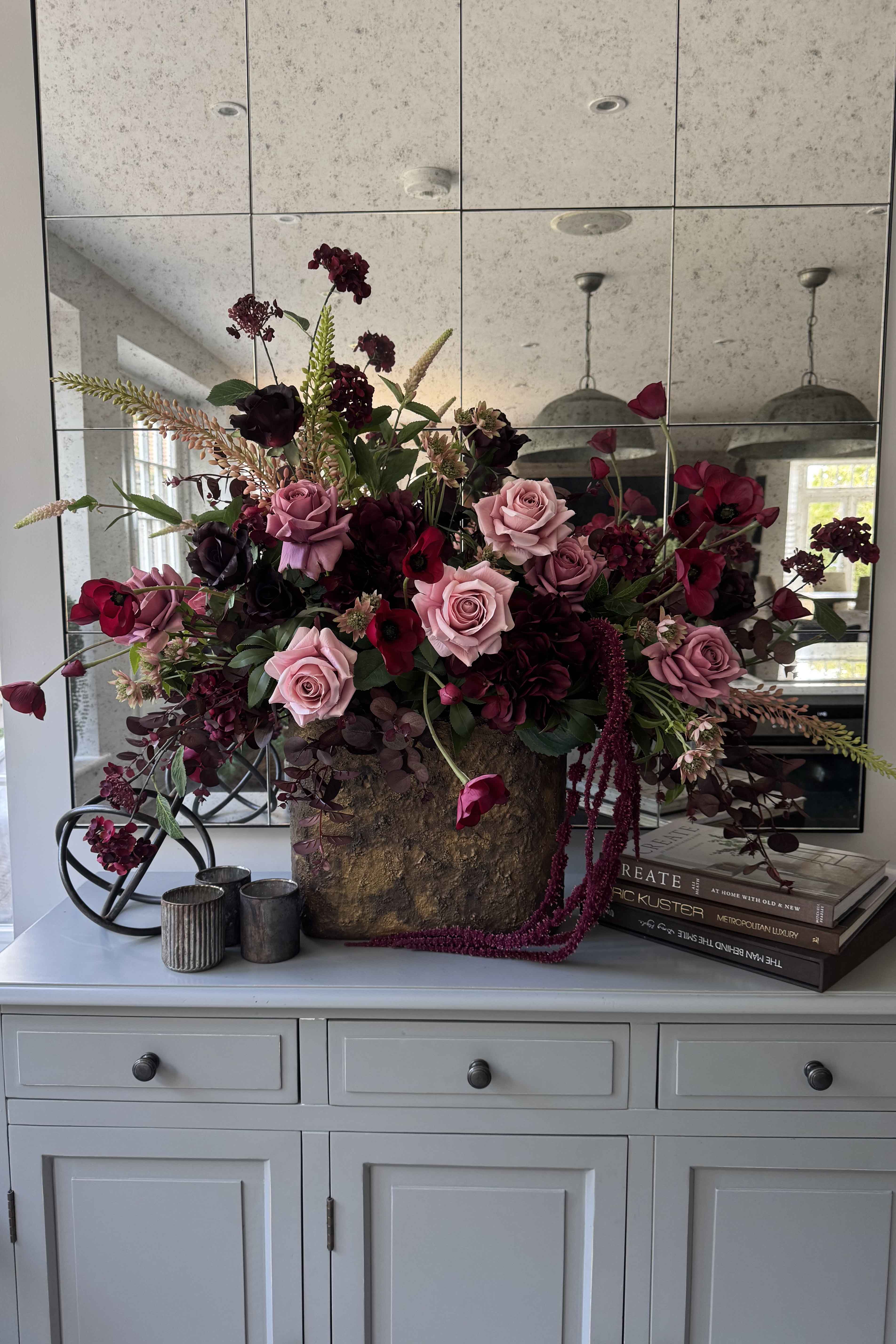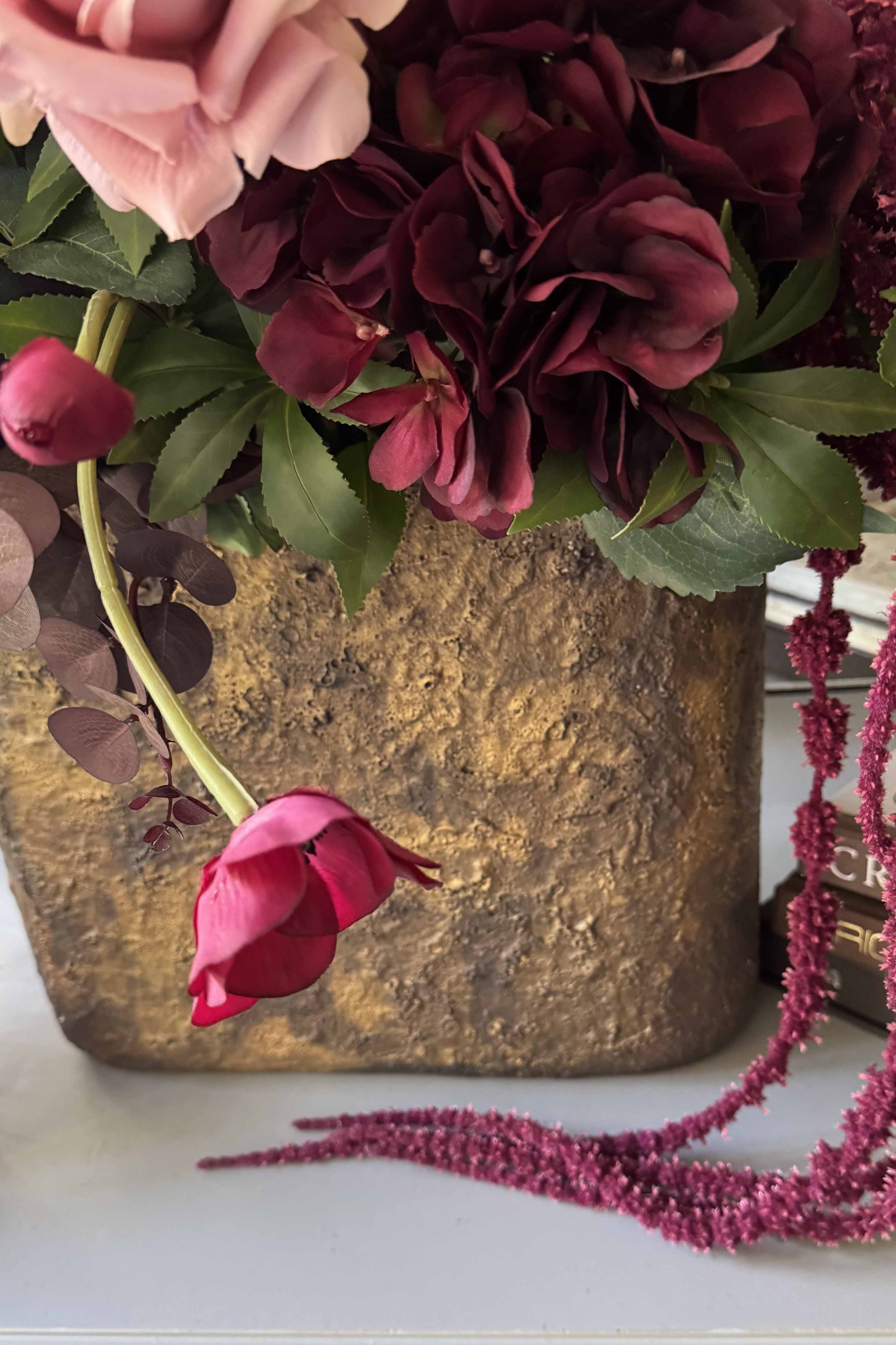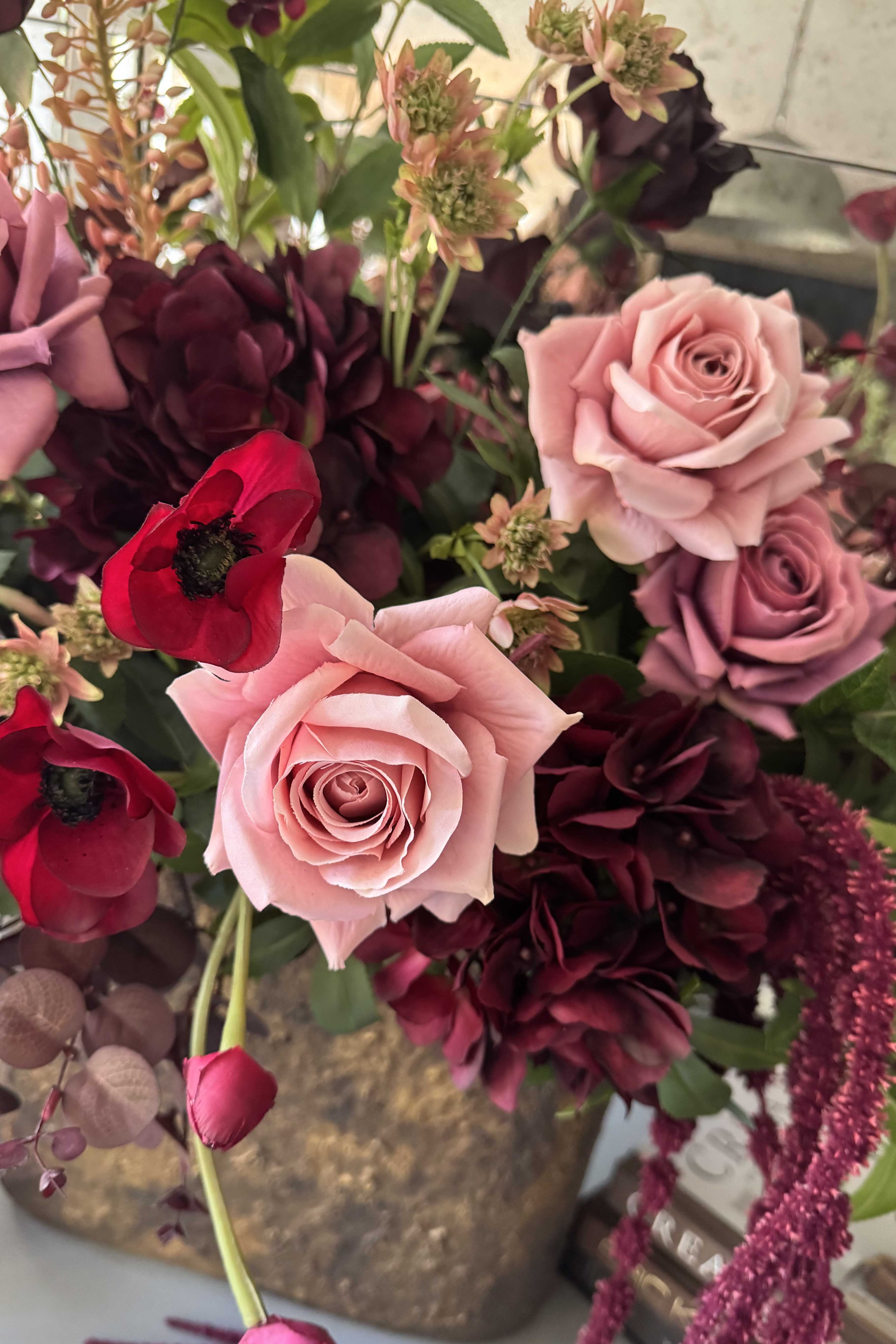 Rose, Anemone and Trailing Amaranthus arranged in a beautiful textured bronze stone vase. Featuring a stunning combination of soft muted pink and deep burgundy florals; thoughtfully arranged with lots of lovely movement in a flat oval shaped vase - perfect for a console or side table.