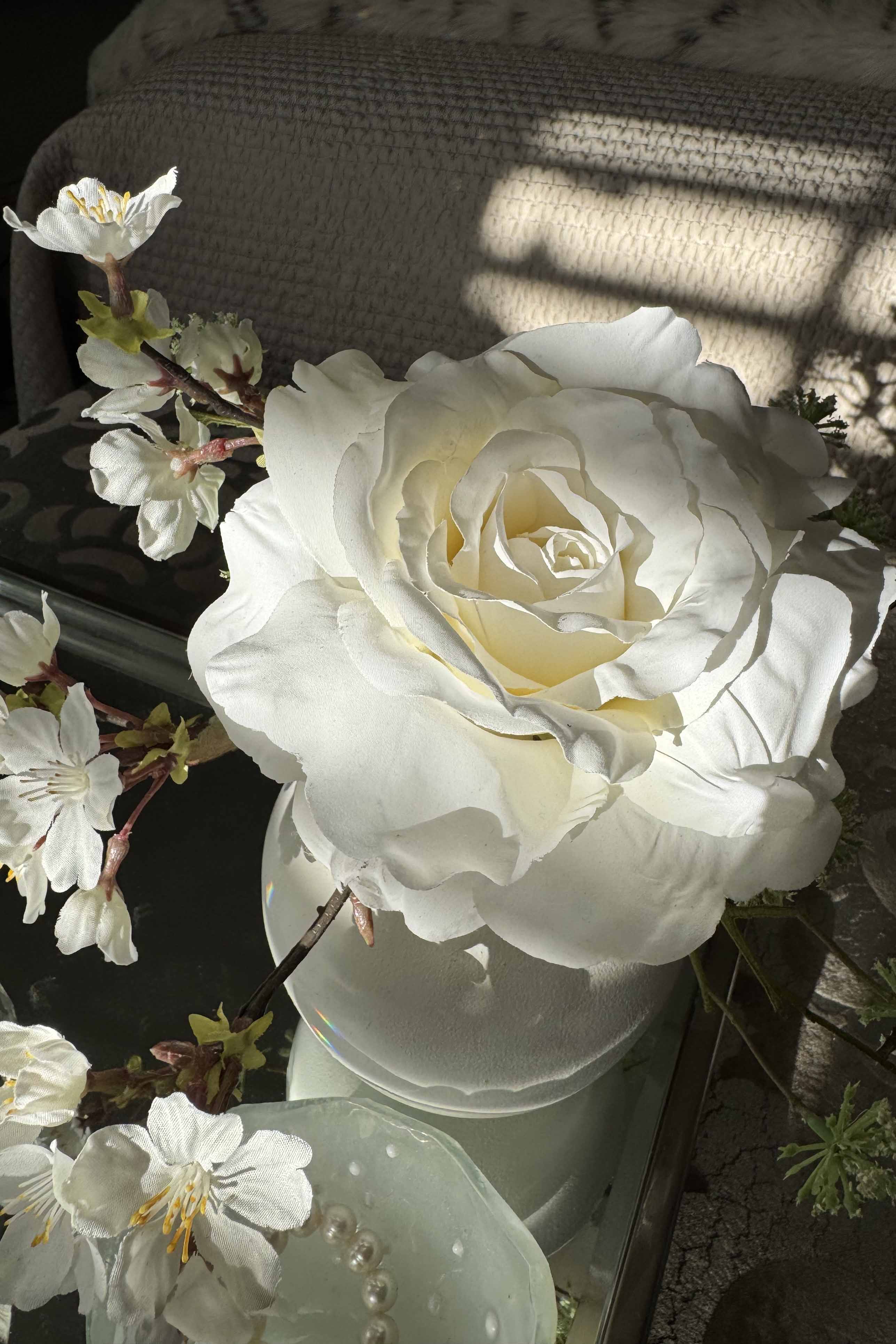 This beautiful arrangement combines a delicate white Rose and Blossom in a white metal bud vase. Naturally arranged with delicate green Queen Anne's Lace to create a refined look with soft textures.