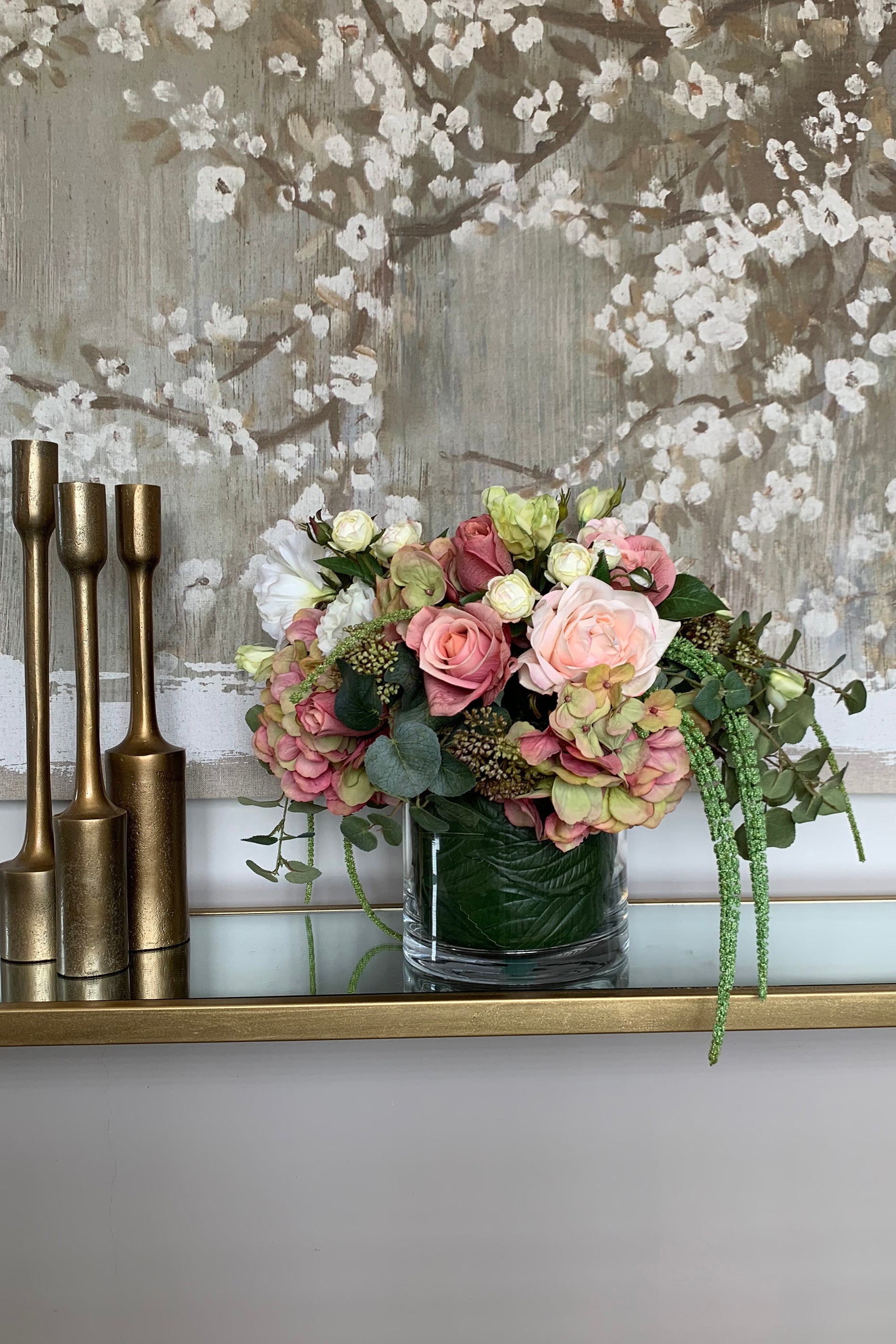 Gorgeous real touch Roses, Hydrangeas, Lisianthus in a beautiful soft coral pink with natural looking greenery.